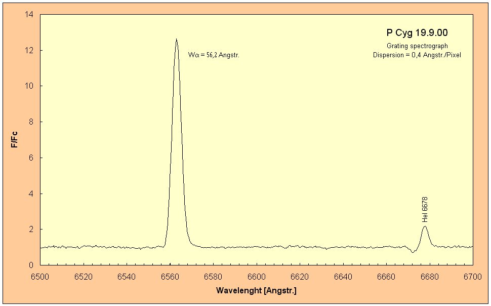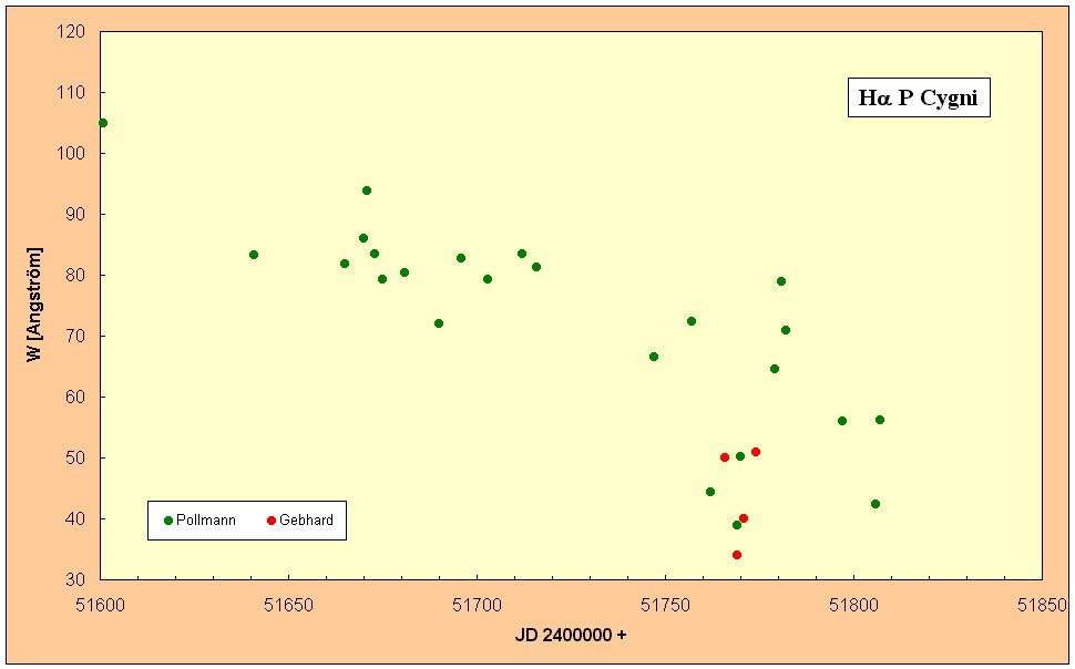 Geschichte: Im Jahr 1600 erreichte P Cyg für 2 Jahre 3.0mag und fiel bis bis 1620 auf 6.0mag ab. Zwischen 1655 und 1659 ereignete sich ein weiterer Helligkeitsausbruch. Im Jahr 1715 betrug die Helligkeit 5.3mag, seitdem nahm sie um 0.15mag pro 100 Jahre zu, d.h. die Oberflächentemperatur nimmt ab. Im Jahr 1990 waren es 4.8mag. Der Stern zeigt ständig leichte Schwankungen der Helligkeit.