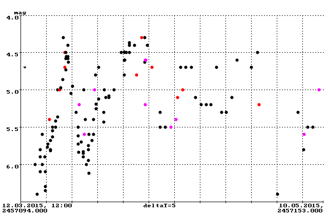 - (14.05.15) CH UMa im ersten Ausbruch seit Februar 2011. Die Helligkeit wird für etwa zehn Tage bei 12 mag liegen.
