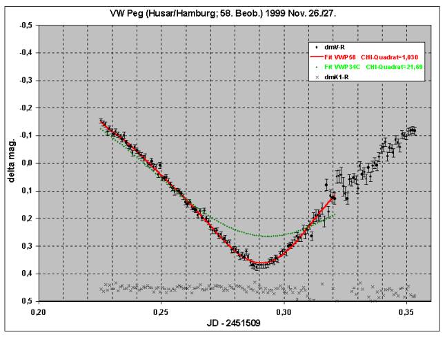 Von VW Pegasi gab es auch nach 3 Jahren intensiver Beobachtungstätigkeit – insgesamt weit über 5000 Einzelmessungen – aufgrund der langen Periode, der langen Bedeckungsdauer, aber auch wetterbedingt überwiegend unvollständig beobachtete Minima. Ich sah mich daher vor die Aufgabe gestellt, diese zu nutzen. Nachdem erkannt war, daß die beobachteten Minima leichte Unterschiede aufwiesen, konnte diese Erkenntnis systematisch eingesetzt werden.