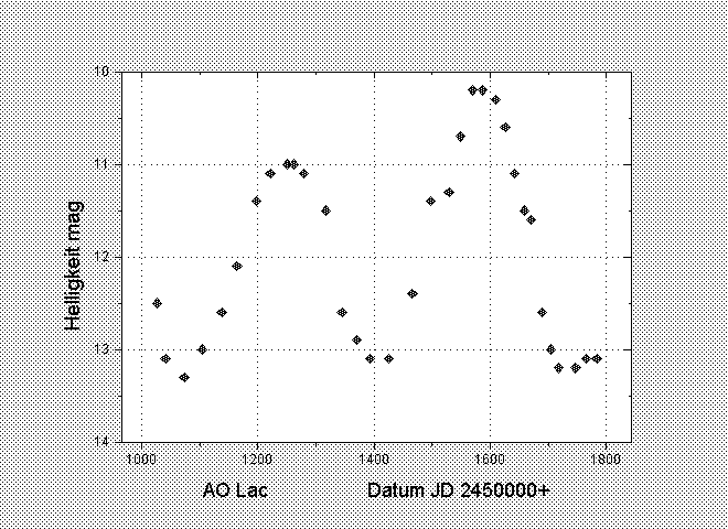 Dies kann ich nun nicht nachvollziehen, da Kohlenstoffsterne alles bieten. Von extremer Symmetrie, über extreme Wellen bis hin zu sekundären Maxima und natürlich auch sehr variablen Lichtkurven (auch dies wird Thema von noch folgenden Darstellungen meiner Programmsterne sein). Dabei ist wichtig, dass nicht etwa die Länge der Periode eine Aussage zulässt wie bei den "normalen" Miras, d.h. bei kurzen Perioden Symmetrie, bei langen Perioden Wellen (sehr verkürzt). So zeigt KL Cyg mit einer Periode von 526 Tagen einen sehr symmetrischen Lichtwechsel, von einer Welle nichts zu sehen! Trotzdem möchte ich den Artikel mit einer Lichtkurve von AO Lac beenden, einem Mira-Stern mit P=300d. Man betrachte den ersten Kurventeil im Vergleich zur Kurve von BI Sct.