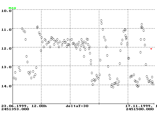 Abb. 1: RX And zur Jahresmitte 1999 während der letzten Stillstandsphase. Die Beobachtungen stammen von verschiedenen BAV Mitgliedern sowie aus dem VSNET.