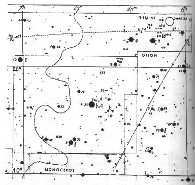 wobei E eine geeignet zu wählende, ganze Epochenzahl ist. Weil sich der Lichtwechsel über lange 7,9 Tage hinzieht, können wir eine Beobachtung in einer Nacht nicht abschließen. Wir verzichten auf eine datumsgenaue Beobachtungsplanung und schätzen den Stern während einer Beobachtungssaison in allen klaren Nächten mindestens einmal. Unterbrochen von Störungen durch den Mond und durch Schlechtwetterperioden werden wir W Gem einmal hell, ein andermal schwach und häufig in mittlerer Helligkeit finden. Der Beobachter bestimmt ein gut gestaffeltes System von etwa 4 benachbarten Vergleichssternen stabiler Helligkeit ABCD und schätzt die Helligkeit des Veränderlichen im Vergleich damit. A muss heller sein als der Veränderliche im hellsten Licht, die schwächeren Anschlußsterne sind sorgfältig derart zu stufen, dass ihre Helligkeitsunterschiede knapp, aber eindeutig reproduzierbar wahrgenommen werden. In der Umgebungskarte sind hierfür geeignete Sterne vorgeschlagen.