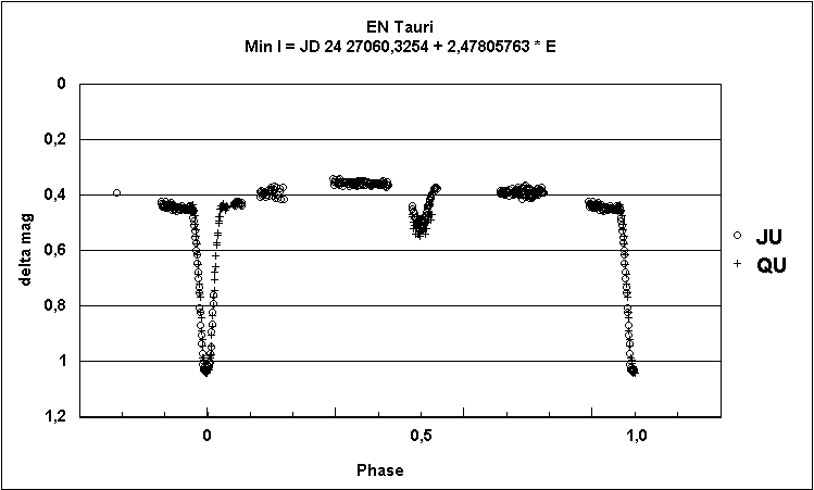 Popper (1996) untersucht Bedeckungsveränderliche mit F - K Spektren und bemerkt zu EN Tau, dass die Spektren eine Verdoppelung der Periode erfordern. Diese Arbeit war für einen von uns (WQ) Anlass, den Stern auf sein Beobachtungsprogramm zu setzen. Die Minima folgten der Ephemeride, aber am 25/26. Januar 2000 war das Minimum nur 0,1...0,2 mag tief (ST-7 mit IR-Sperrfilter). Ein früheres Minimum war 0,6 mag tief. Nun bestand der Wunsch, eine komplette Lichtkurve zu beobachten, und seit 2001 beteiligte sich auch H. Jungbluth an der Beobachtung mit seinem C8 + ungefilterter ST-7. Die gemeinsam ohne Filter gewonnene Lichtkurve zeigt Abb. 1.